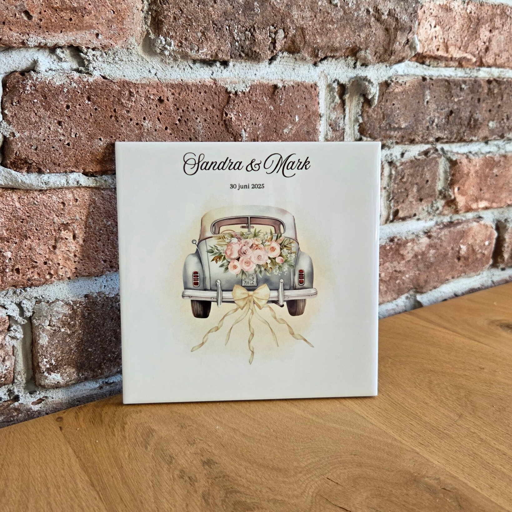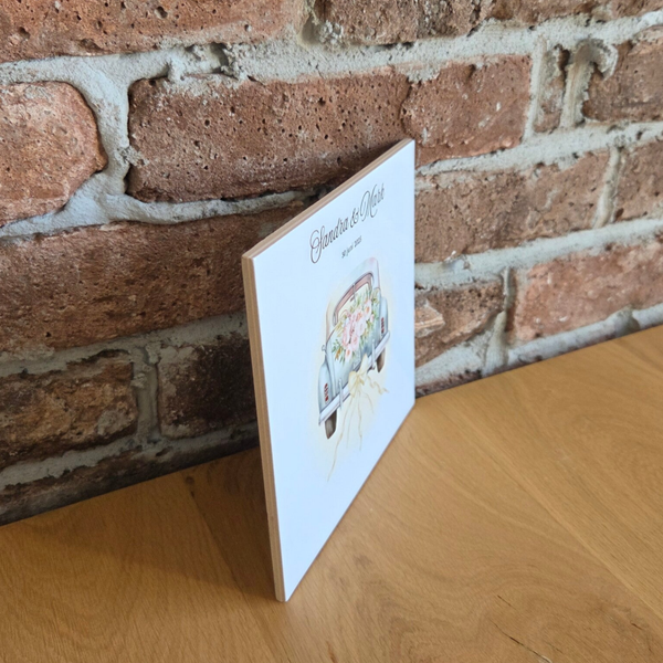 Wil je het bruidspaar geld geven als huwelijkscadeau maar niet zomaar een enveloppe met geld overhandigen? Kies dan voor een origineel geldcadeau: een tegeltje met daarop hun namen, trouwdatum én een illustratie van een trouwauto.