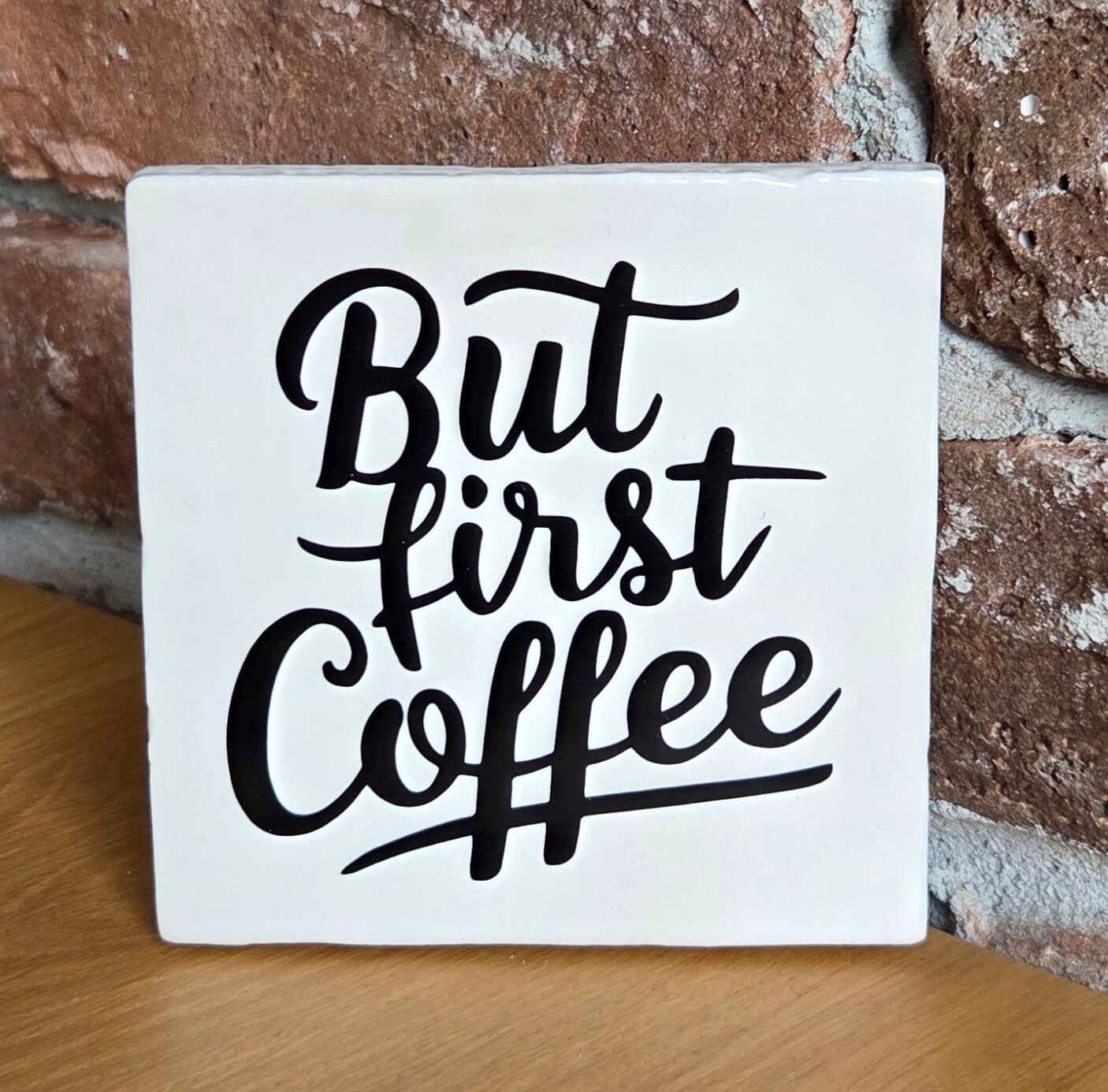 Home / Tegeltjes / Tegeltjes met vinyl / Tegeltje 'but first coffee'
