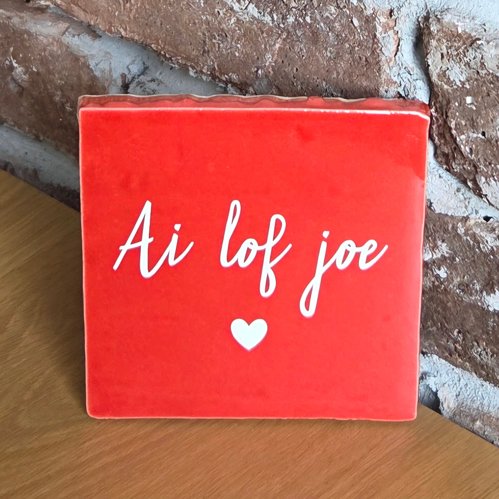 Met dit vrolijke tegeltje zeg je “ik hou van jou” op z’n eigen, unieke manier. “Ai lof joe” tovert een glimlach op ieders gezicht en is een heerlijk cadeau voor je partner, beste vriend(in) of jezelf.