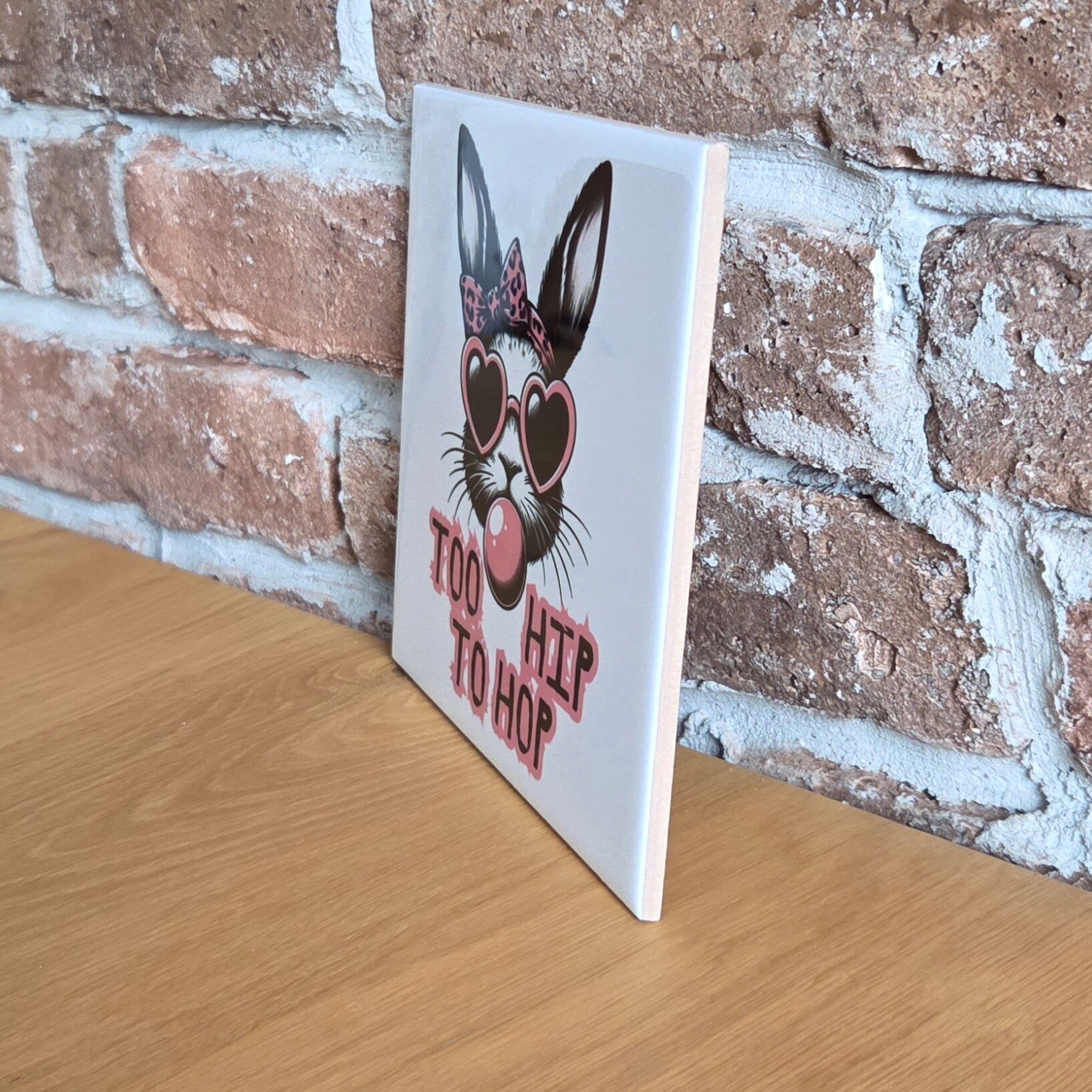 Op zoek naar een originele en stijlvolle paasdecoratie? Dit tegeltje 'too hip to hop' is de perfecte toevoeging aan jouw interieur tijdens Pasen. Met een speelse knipoog naar de paashaas brengt dit keramische tegeltje humor en karakter in huis.