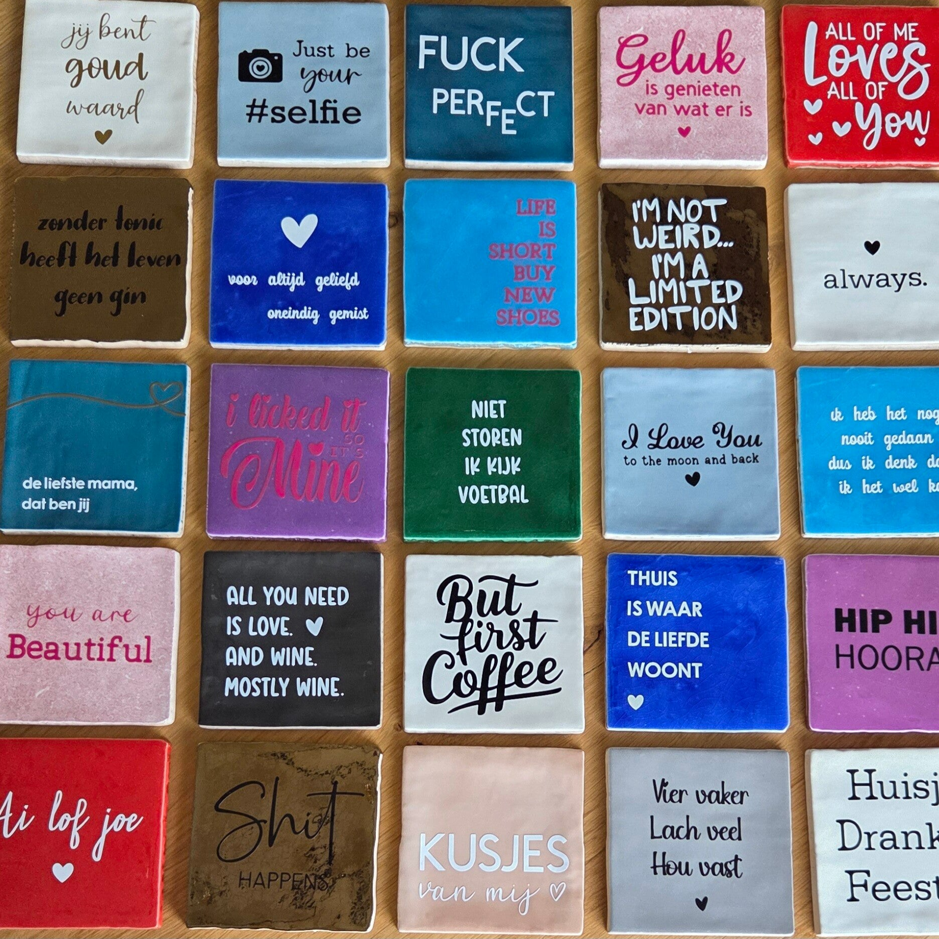 - Handgemaakte tegeltjes met teksten, prints en illustraties